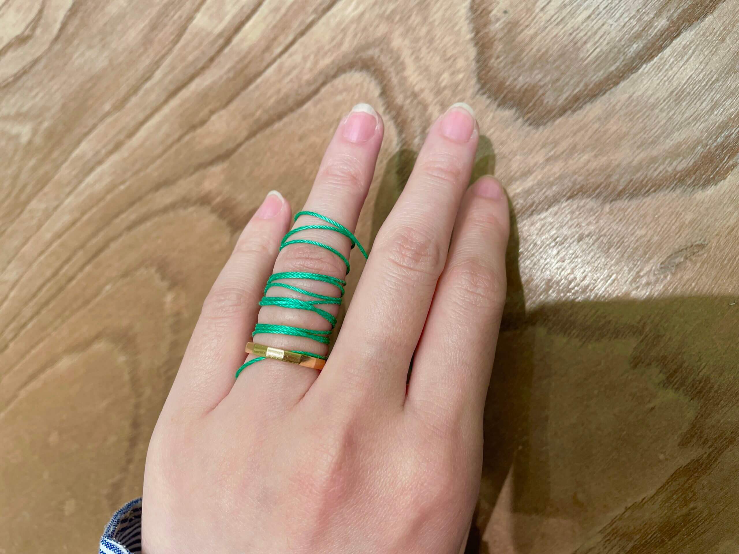 指の間に糸を通し、ぐるぐる巻きに、その上を指輪を滑らせるような感じです。