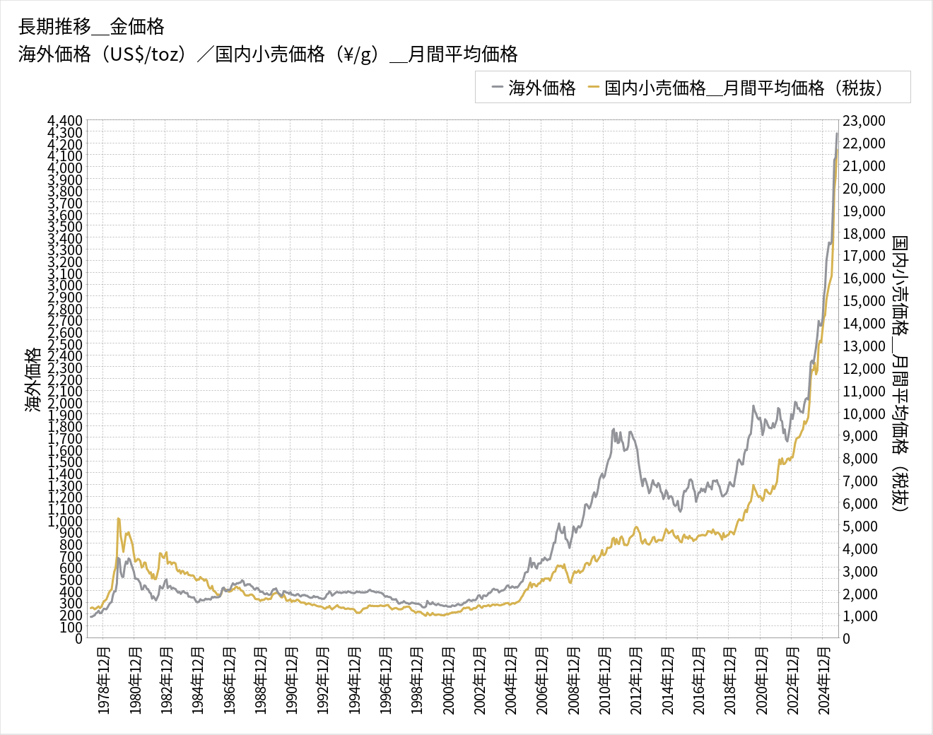 50余年で約28倍。連日ニュースで報じられるこの数字は、単なる市場の変動ではなく、私たちが扱う「素材」が持つ圧倒的な価値の証明でもあります。私たちはこの重みを、お客様との信頼の重みとして真摯に受け止めてきました。